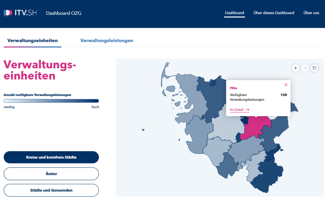 Mit DiDaSH bieten wir erstmals einen zentralen, öffentlich zugänglichen Überblick über den Stand der Verwaltungsdigitalisierung in Schleswig-Holstein. Das Dashboard macht transparent, wie weit die Umsetzung des Onlinezugangsgesetz – Gesetz zur Digitalisierung der Verwaltungsleistungen in Bund, Ländern und Kommunen. Weiterlesen...Onlinezugangsgesetzes (OZG) in den Kommunen fortgeschritten ist und unterstützt Sie dabei, Entwicklungen fundiert nachzuvollziehen und gezielt zu steuern.